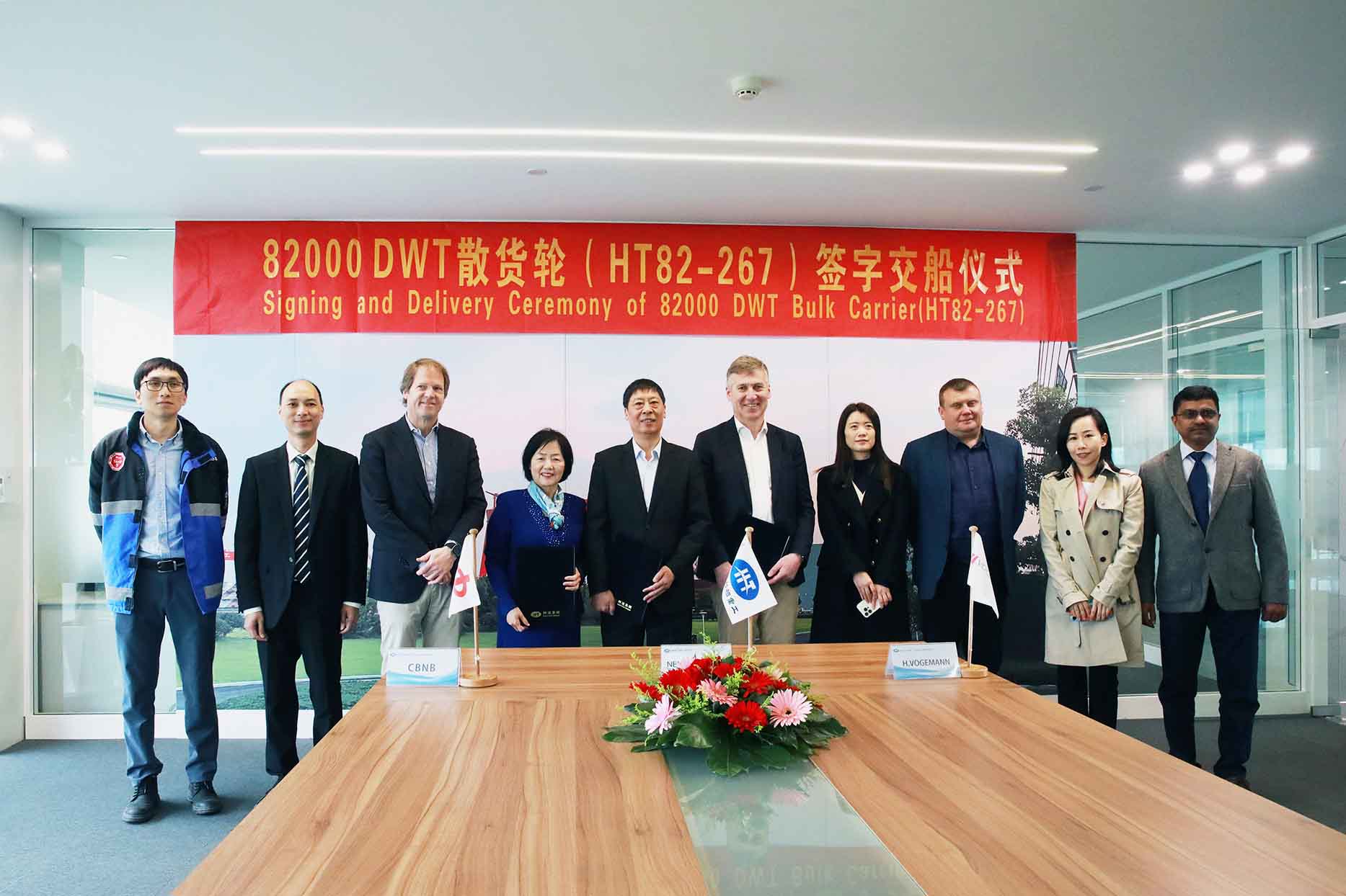 2023年4月6日,韓通為德國H. Vogemann船東建造的82000噸散貨輪首制船 “ROSTRUM HEDONIST”(船體號(hào):HT82-267)順利命名并成功簽字交付。